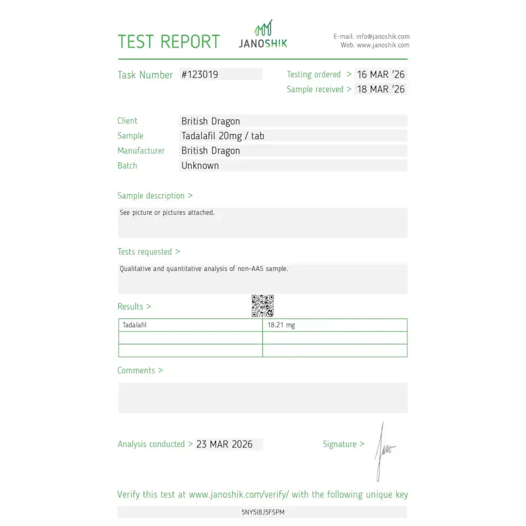 Trade Name: Cialis Compound: Tadalafil Citrate Strength: 20 mg/pill Container: 100 Pills Manufacturer: Dragon PharmaLab Tested: View Result